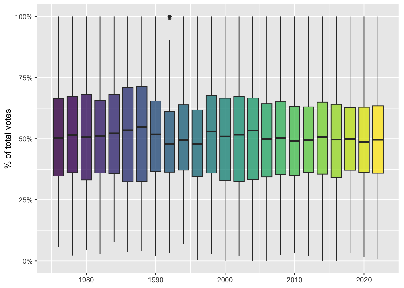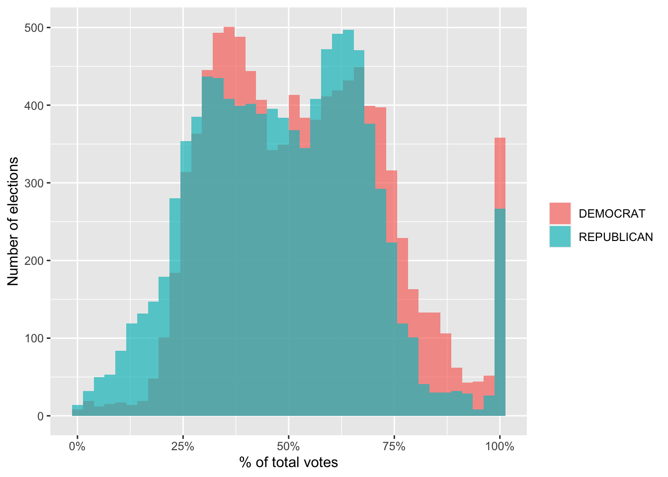 labs(x = "% of total votes", y = "Number of elections", fill = NULL)