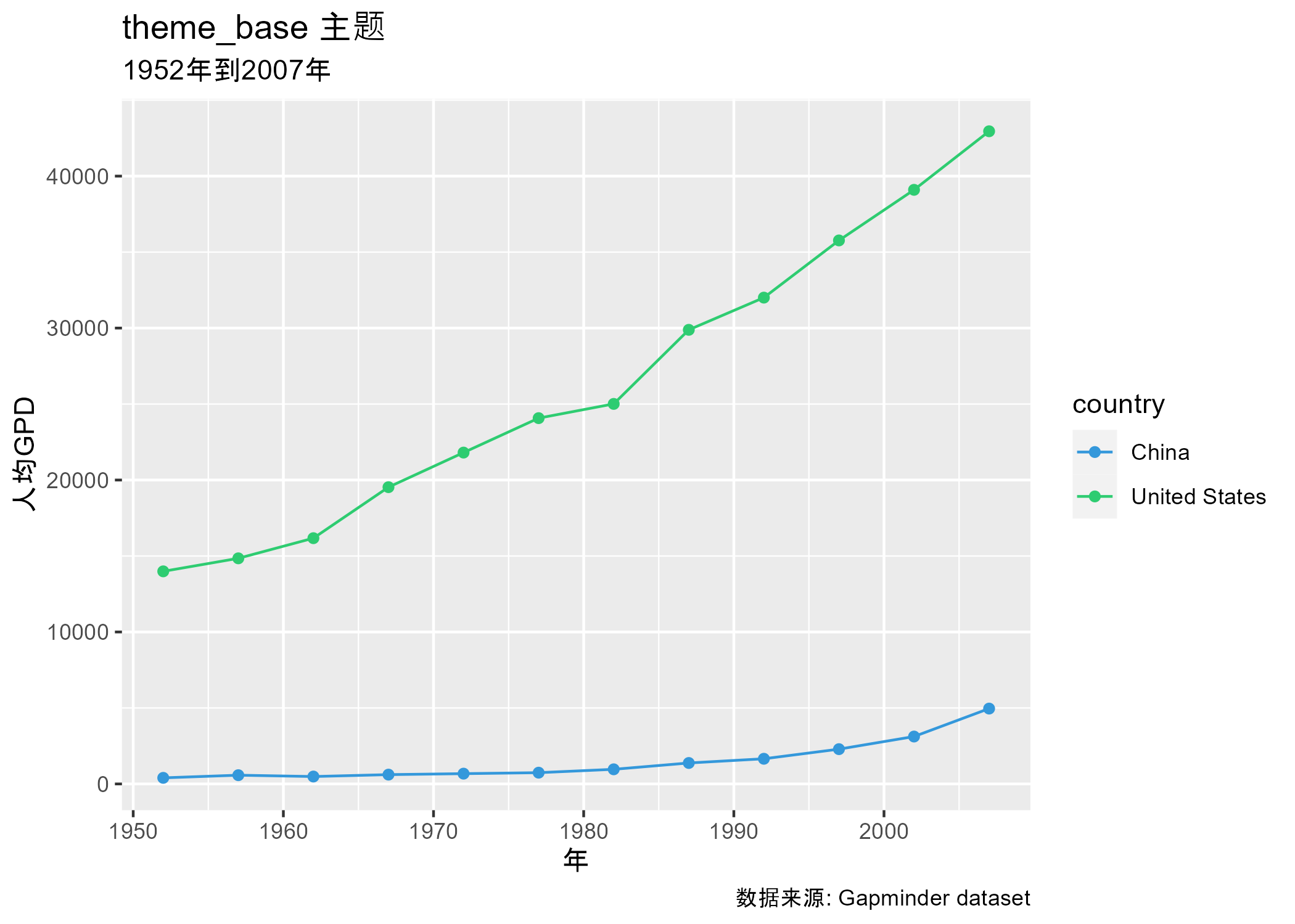 theme_base=ggplot(data=gapminder_data_cn_us, aes(x=year, y=gdpPercap,color=country)) +