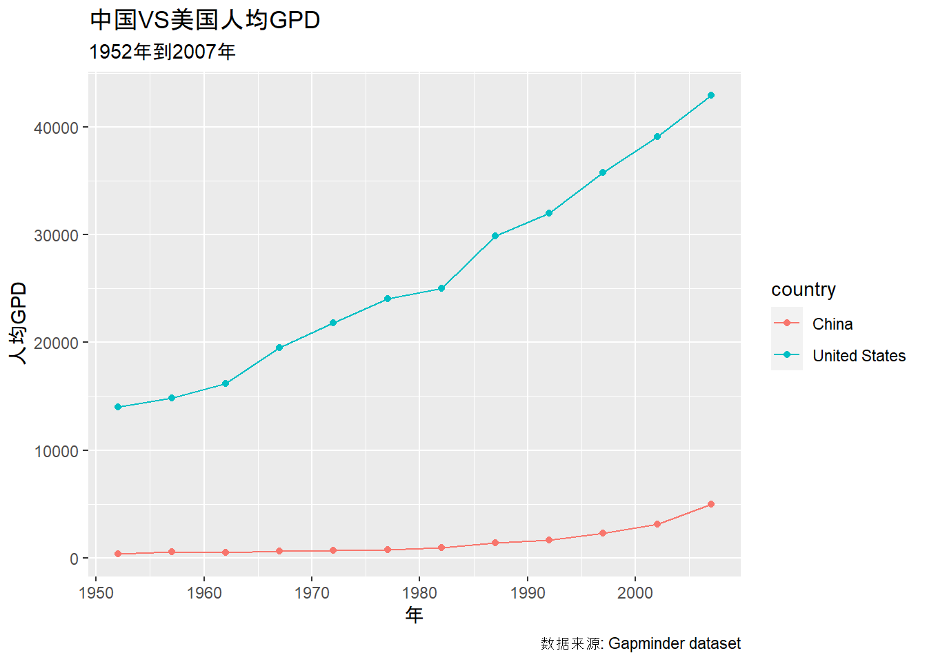 theme_gdocs=ggplot(data=gapminder_data_cn_us, aes(x=year, y=gdpPercap,color=country)) +