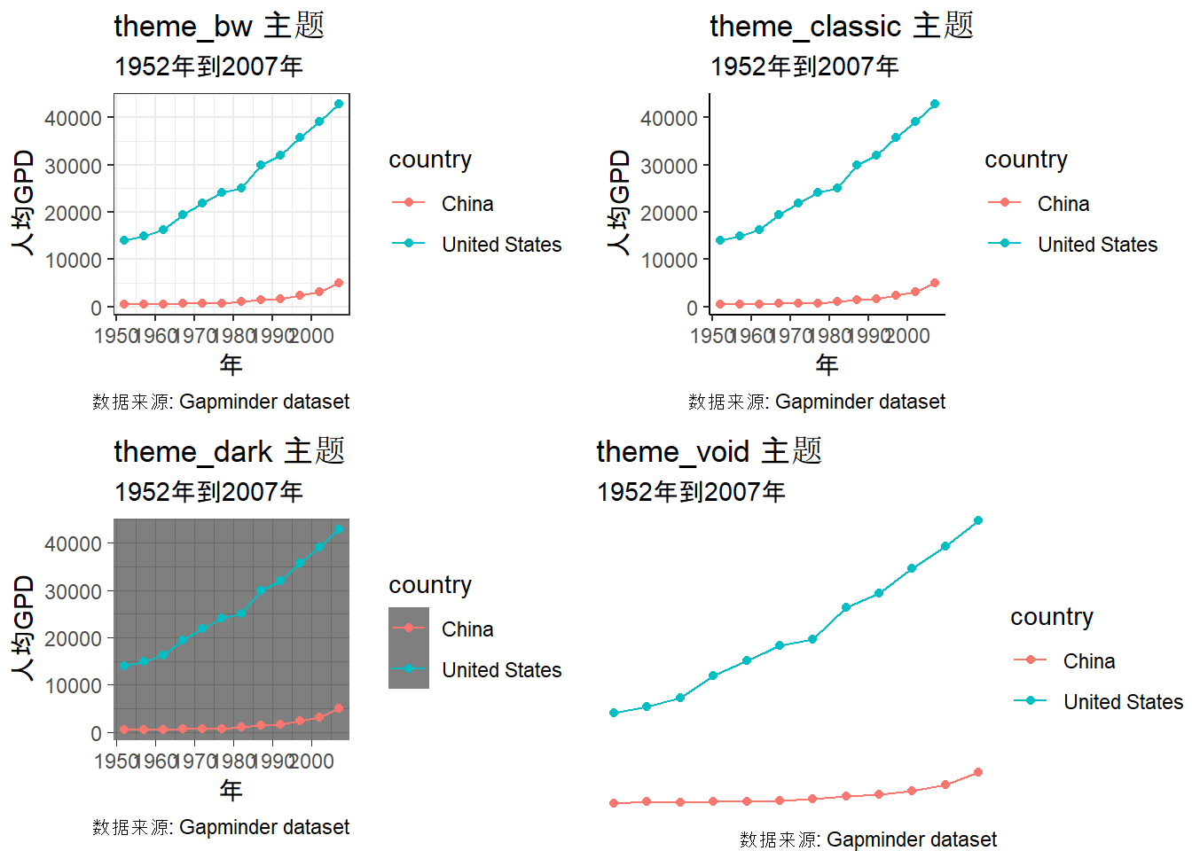 theme_dark=ggplot(data=gapminder_data_cn_us, aes(x=year, y=gdpPercap,color=country)) +
