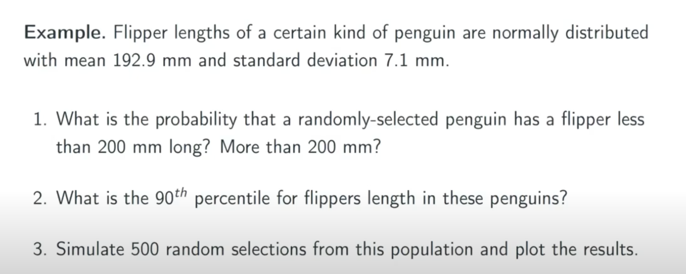 Flipper lengths of a certain kind of penguin are normally distributed with mean 192.9 mm and standard deviation 7.1 mm.