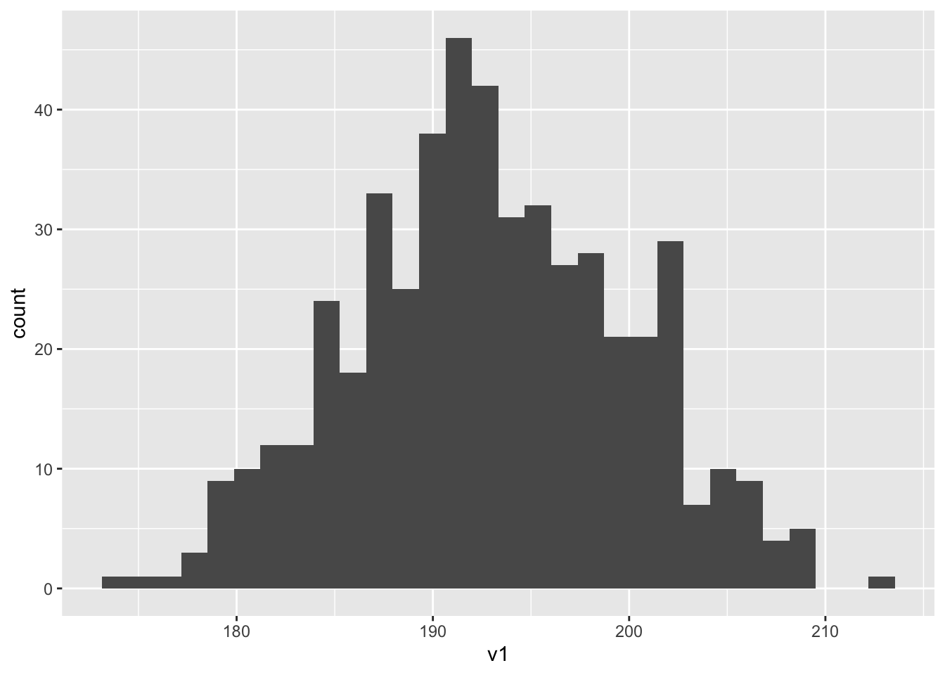 ggplot001=ggplot(data001, aes(v1)) + geom_histogram()