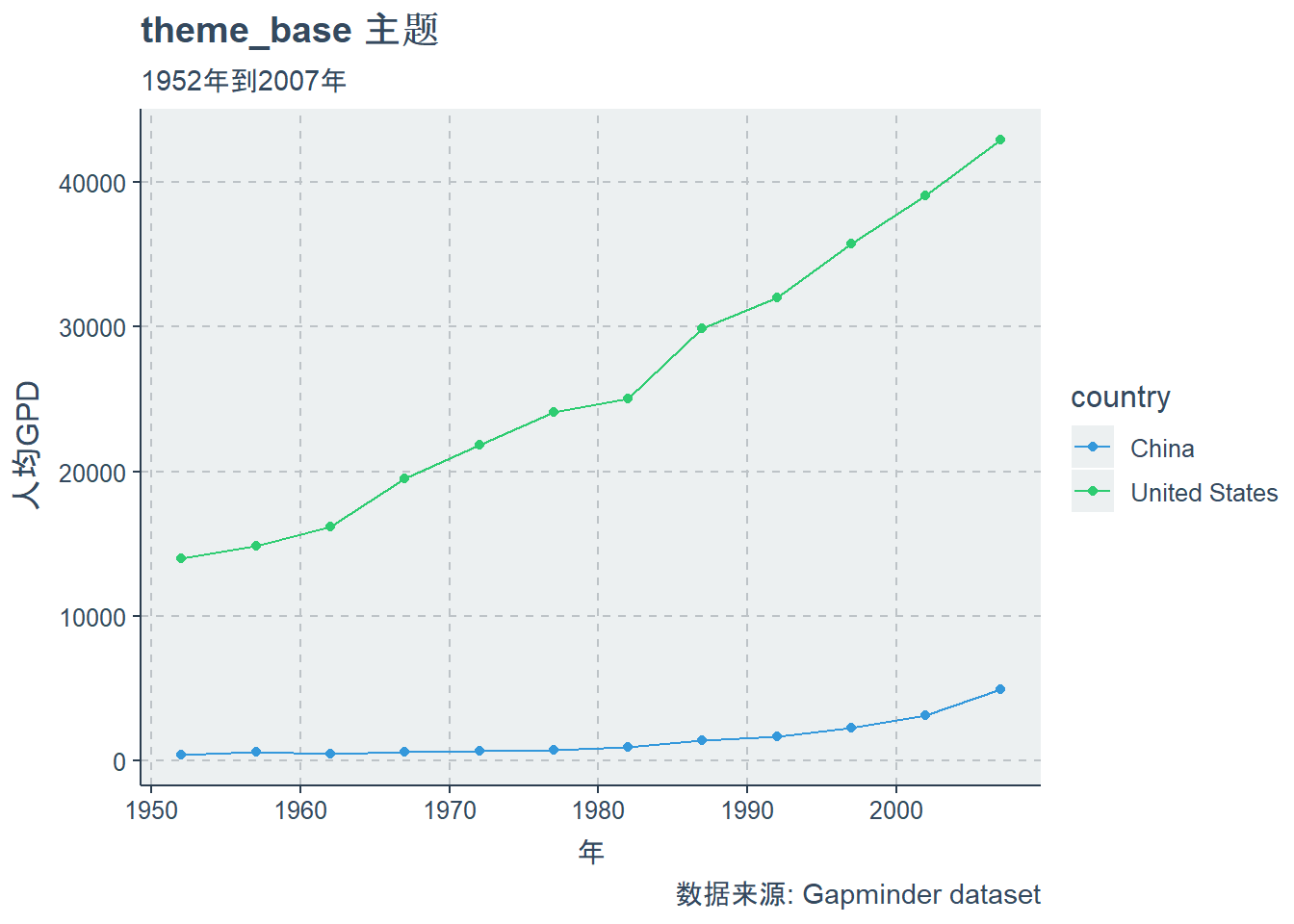 gapminder_data_cn_us=gapminder_data %>% filter(country %in% c('China','United States')) %>% filter(year==year)中国VS美国人均GPD的线性图,更改主题