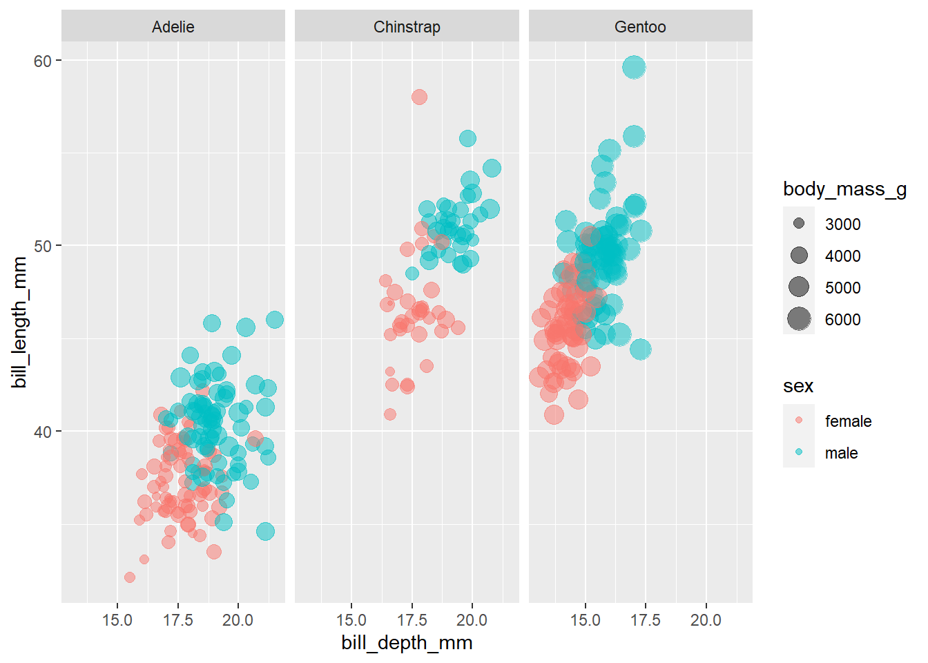 ggplot(aes(bill_depth_mm, bill_length_mm, color = sex, size = body_mass_g)) +