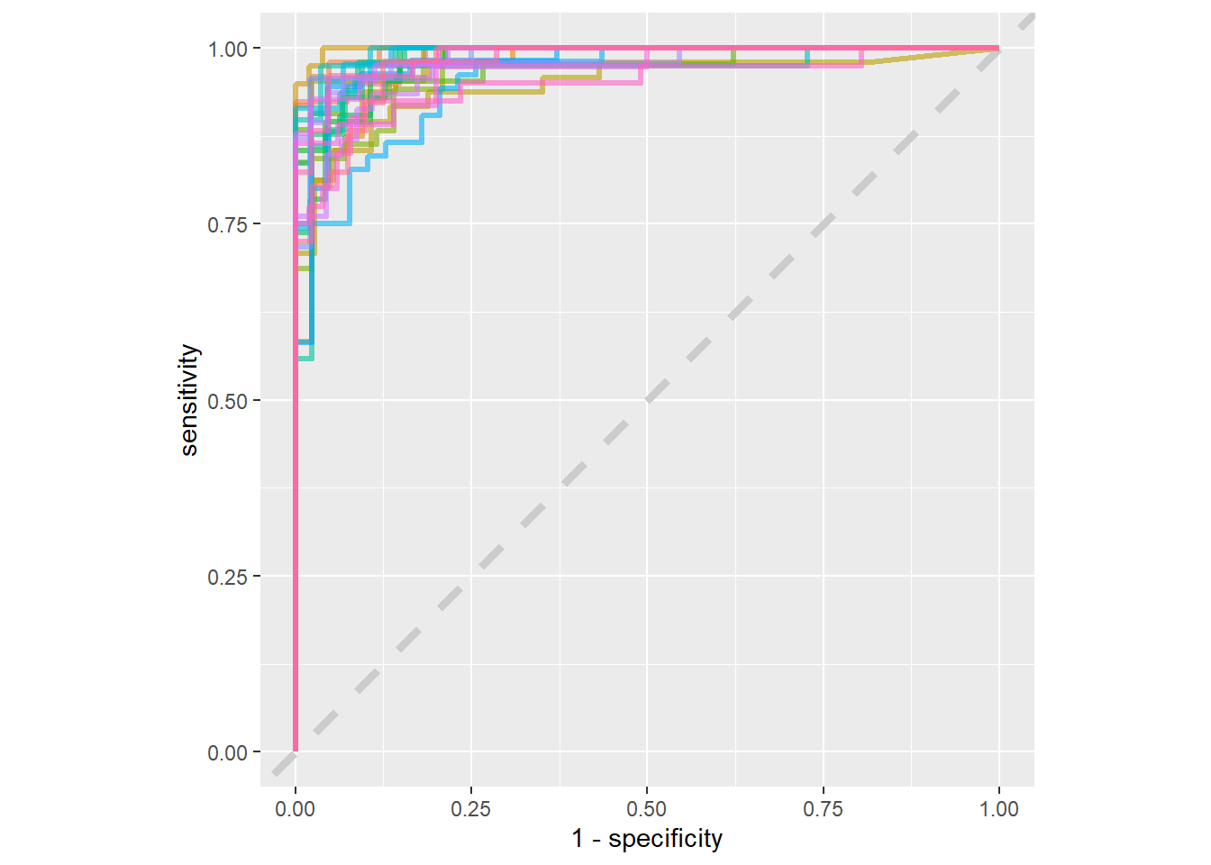ggplot(aes(1 - specificity, sensitivity, color = id)) +