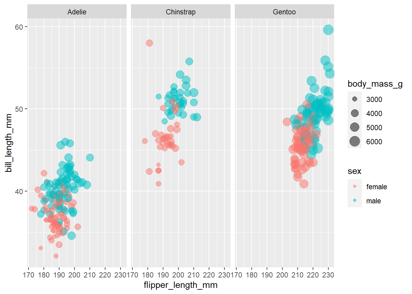 ggplot(aes(flipper_length_mm, bill_length_mm, color = sex, size = body_mass_g)) +